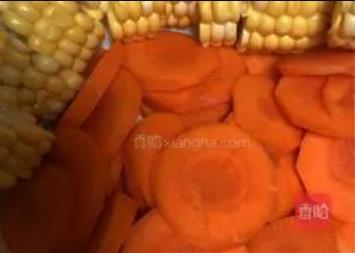 4. Put ginger slices, water, pork bones, corn, and carrots into the pot.