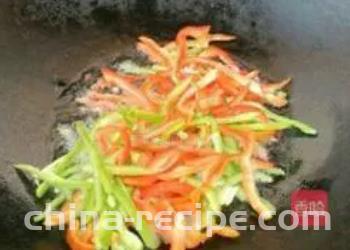 5. Heat oil and scallion flowers in a pot, stir fry fragrant green and red peppers, add salt and soy sauce to the pot, stir fry green and red peppers, and stir fry until mature