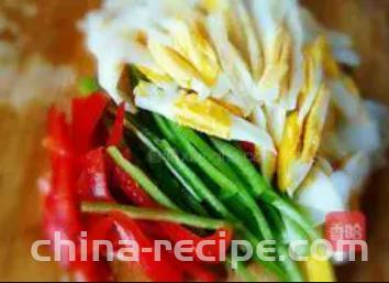 3. The fried eggs should be cut into shreds, and the green and red peppers should also be cut into shreds