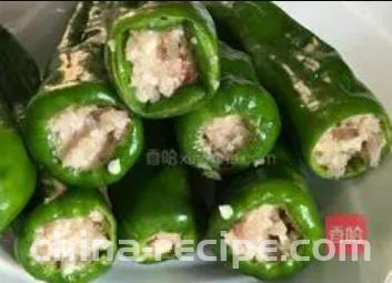 7. Slowly put the mixed meat filling into the green pepper with chopsticks