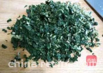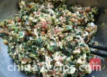 11. After cooling the radish leaves, pour them into the meat filling and stir evenly.