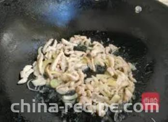 5. After heating the oil in the pot, stir fry the shredded chicken until it turns white.