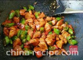 5. After stir frying the diced chicken, add chili and stir fry evenly