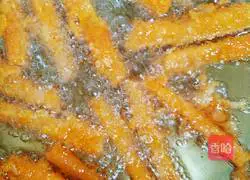 8. Put oil in the pot, wrap the pumpkin strips with breadcrumbs at 50% heat, and fry slowly over low heat.