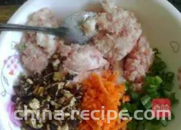 5. Put the sweet potato flour with light soy sauce into the meat filling and stir well, then add a little salt