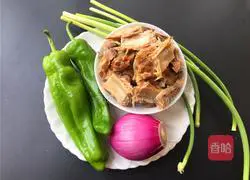 The method of stir frying green peppers and onions with preserved meat