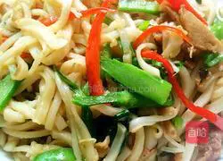 3. Cut onions, green and red peppers into shreds, scallions into sections, and meat rolls into strips for later use