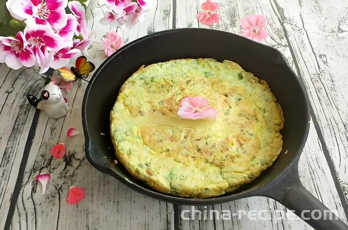 6. Heat a small pan with an appropriate amount of oil, pour in the locust flower batter, and use a spoon to evenly spread the egg batter