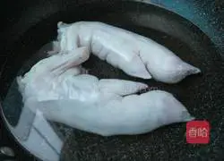 4. Add cold water to the pot, add pig feet and blanch in water. After boiling, remove any foam and continue blanching for 3 minutes before turning off the heat. Soak in the pot until it is not too hot to handle.
