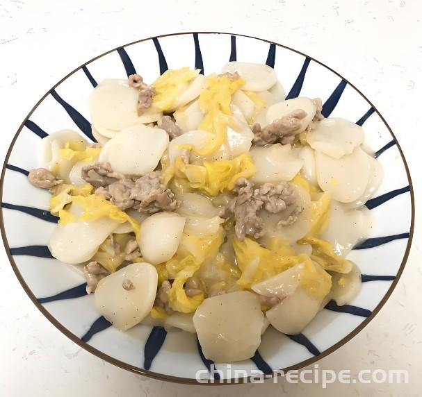 The method of stir frying rice cake with shredded cabbage and pork