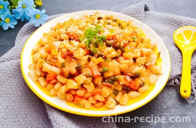 9. Stir fry until the onions turn slightly yellow, add diced carrots and garlic sprouts, add salt, and stir fry until the carrots and garlic sprouts become soft