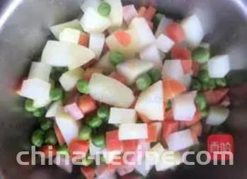 1. Cut the cooked potatoes, ham, and raw carrots for later use