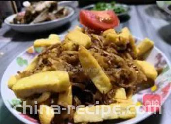 5. Fold the opened thin sheets together and cut them into thin strips. Cut dried tofu into 1cm * 1cm * 4cm silk. Heat dried tofu in an oil pan over medium heat, and fry dried tofu until golden on the surface.