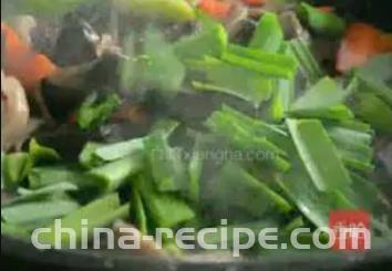 8. Put the carrots in the pot and stir fry until they are cut off. Add salt and soy sauce. When out of the pot, add garlic sprouts and stir fry twice